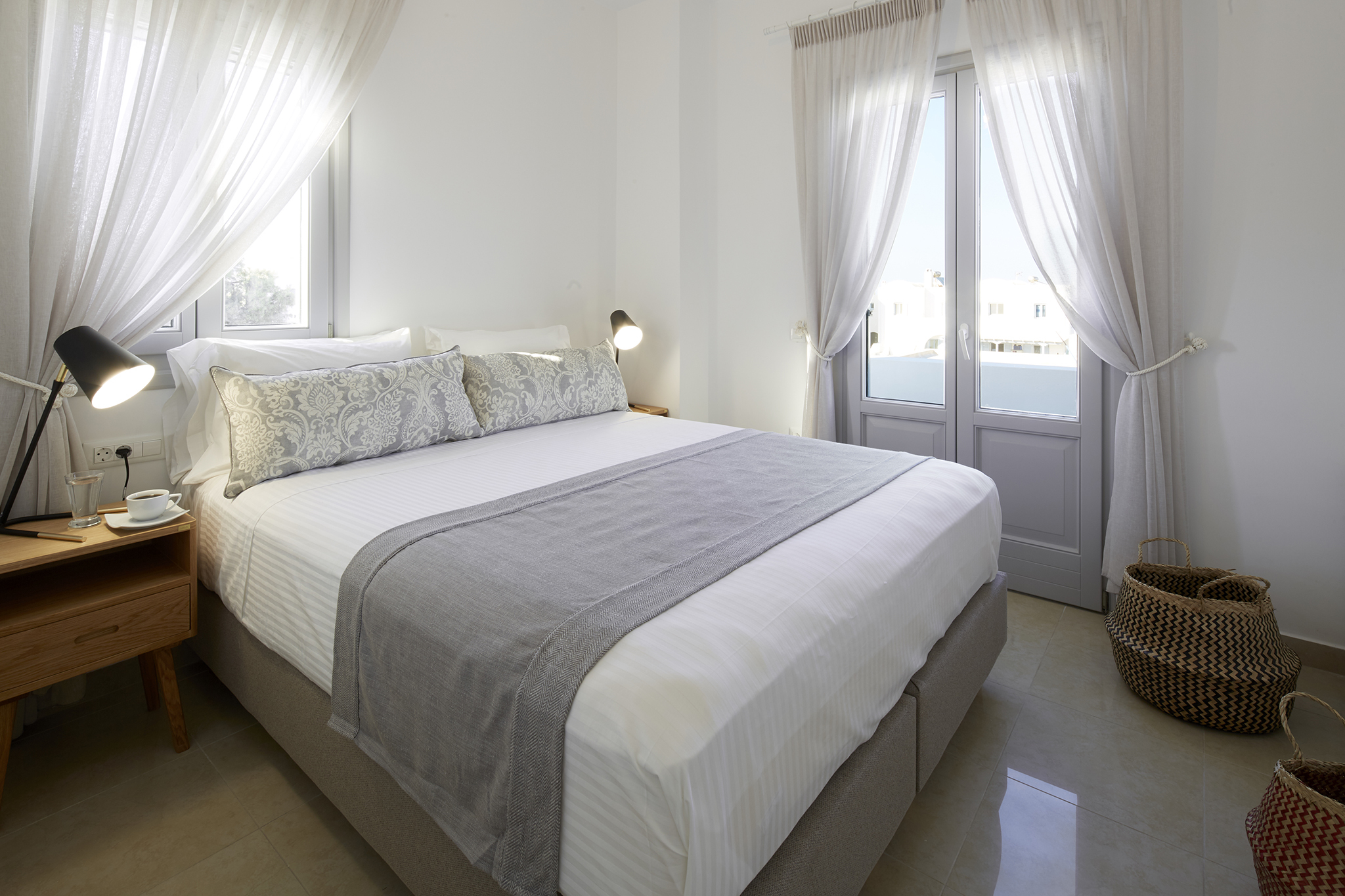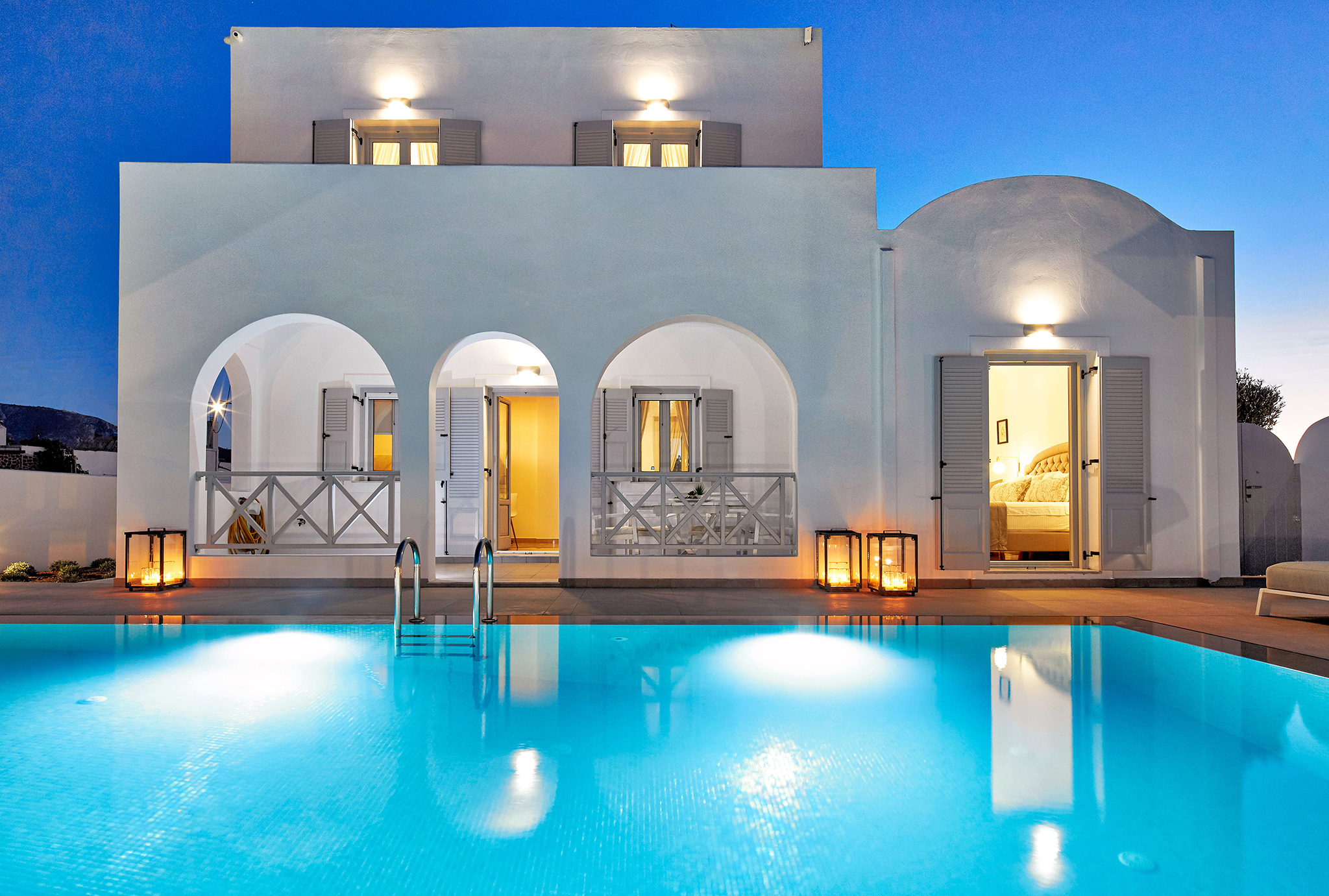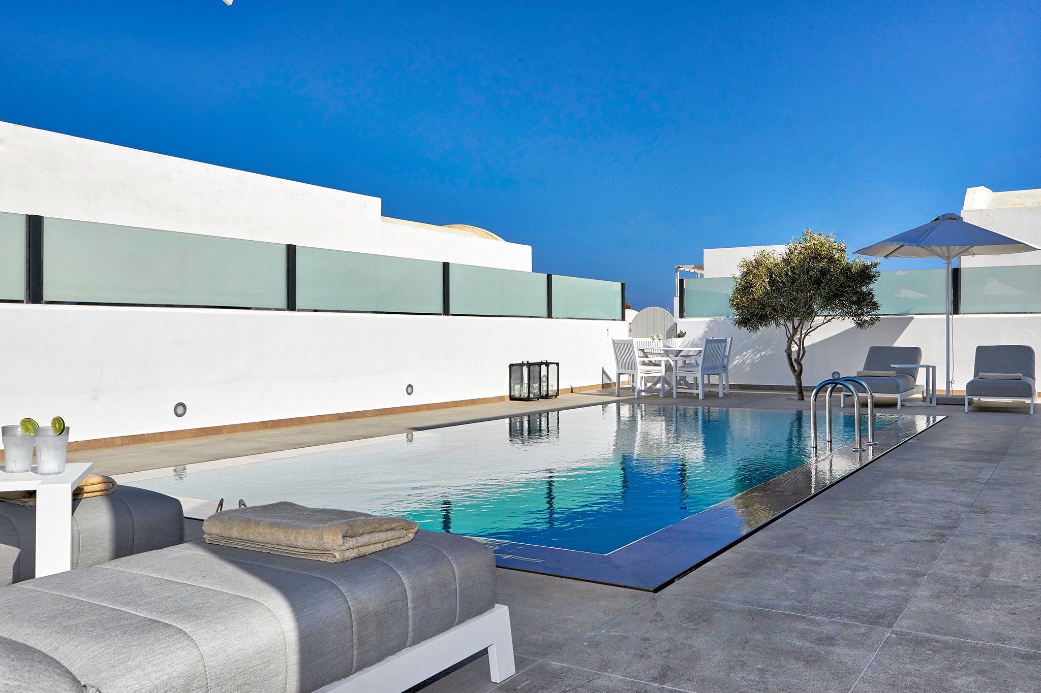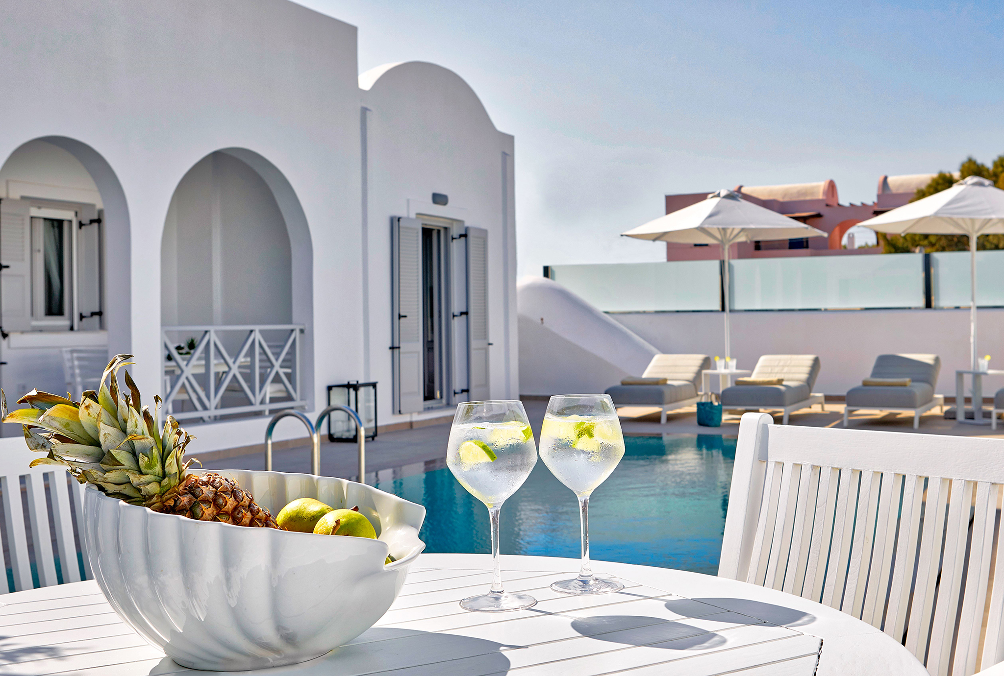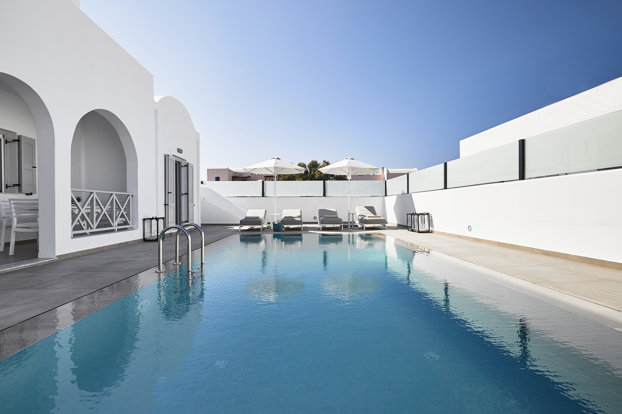 - Refined interiors with minimalist Cycladic design