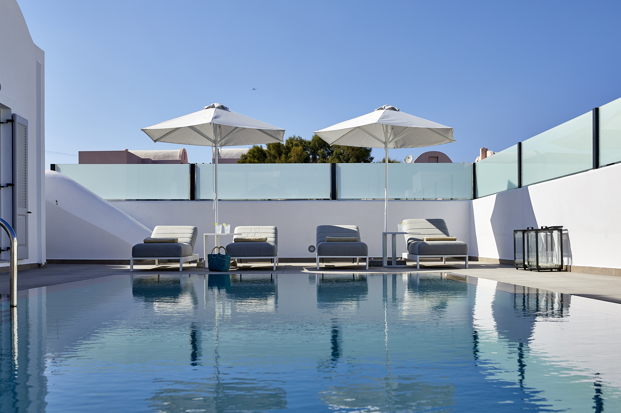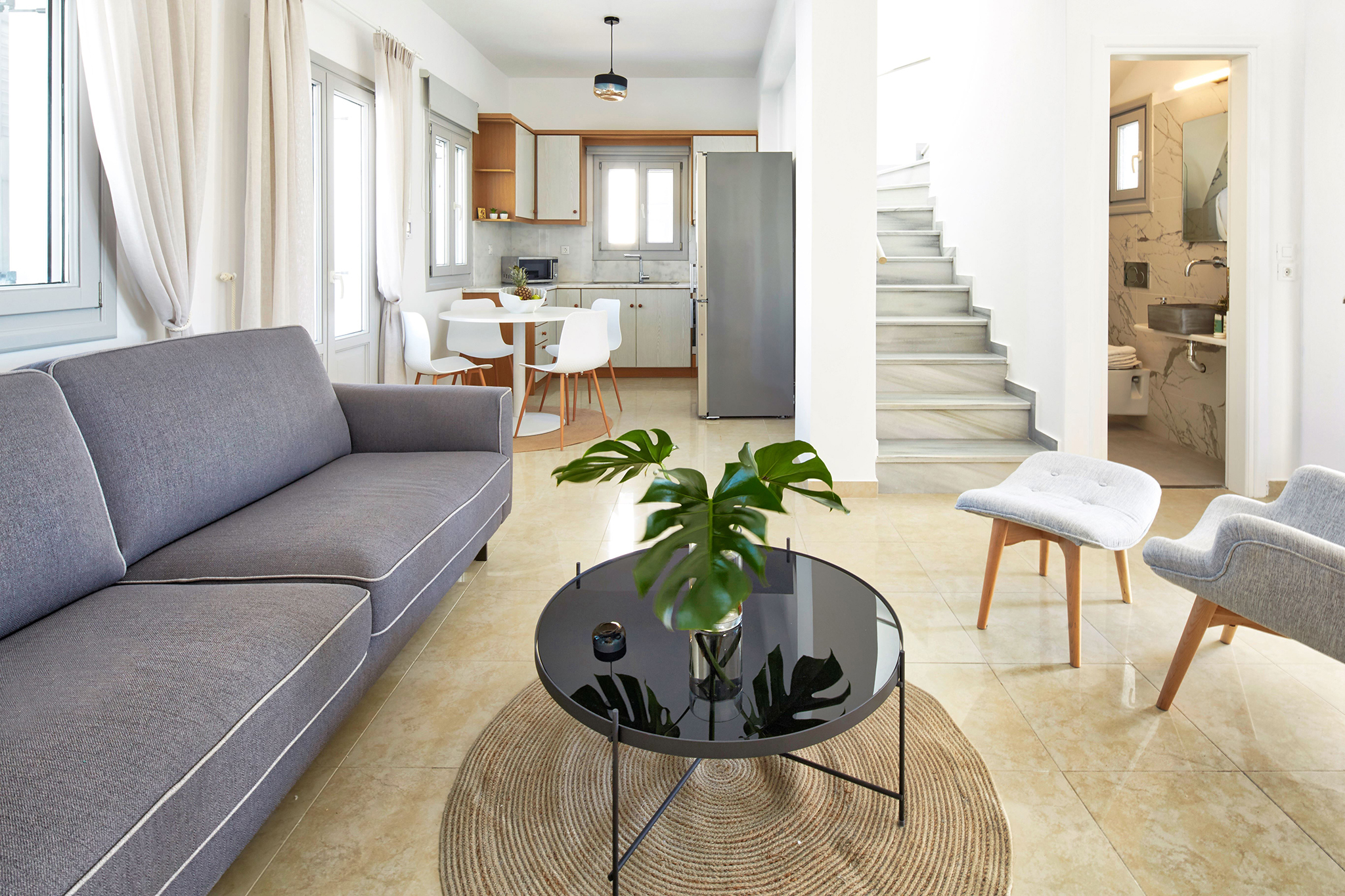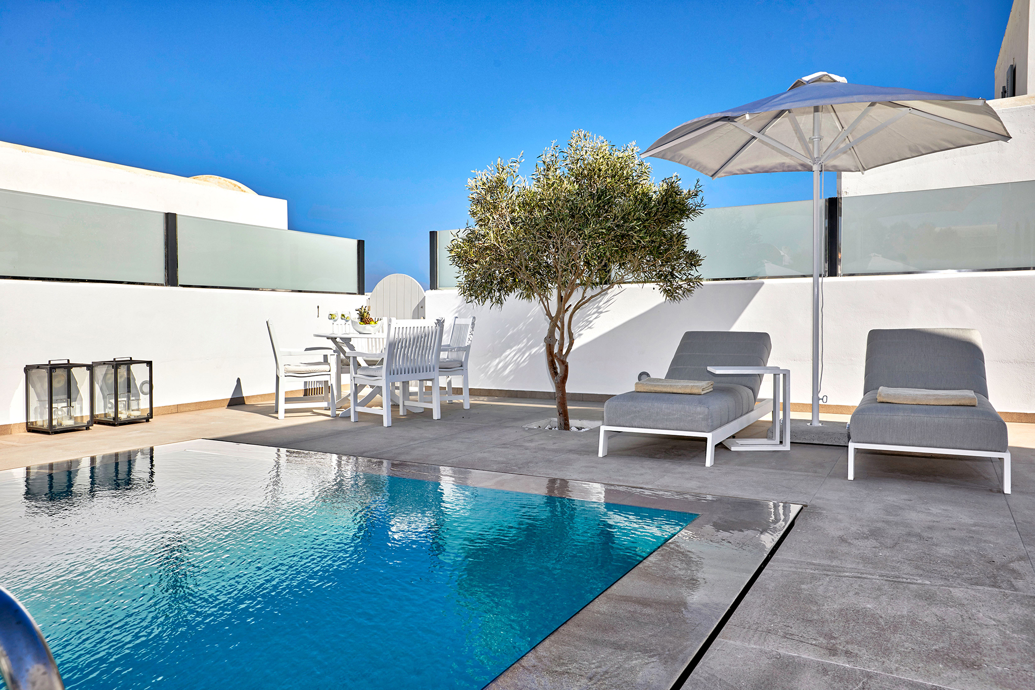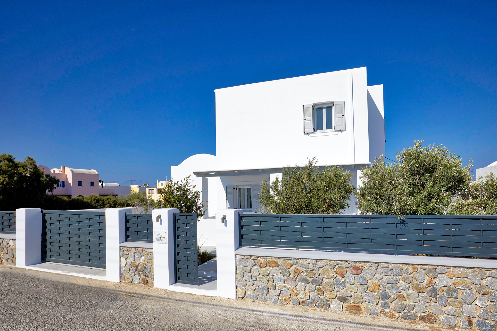 - Refined interiors with minimalist Cycladic design